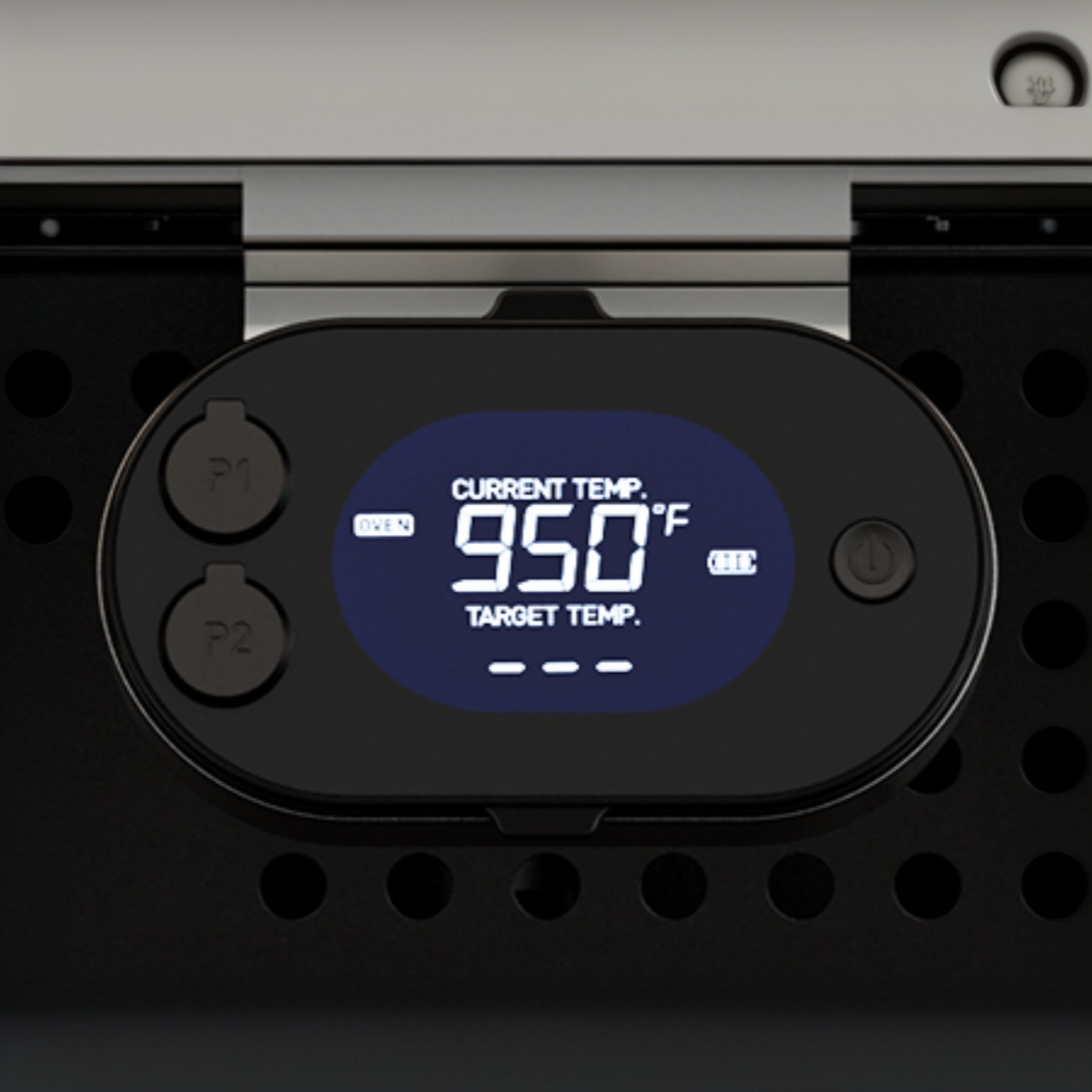 A front digital display shows real-time ambient and stone temperature, helping you set precise heat levels for pizzas, baking, roasting, and other controlled-heat cooking styles.
