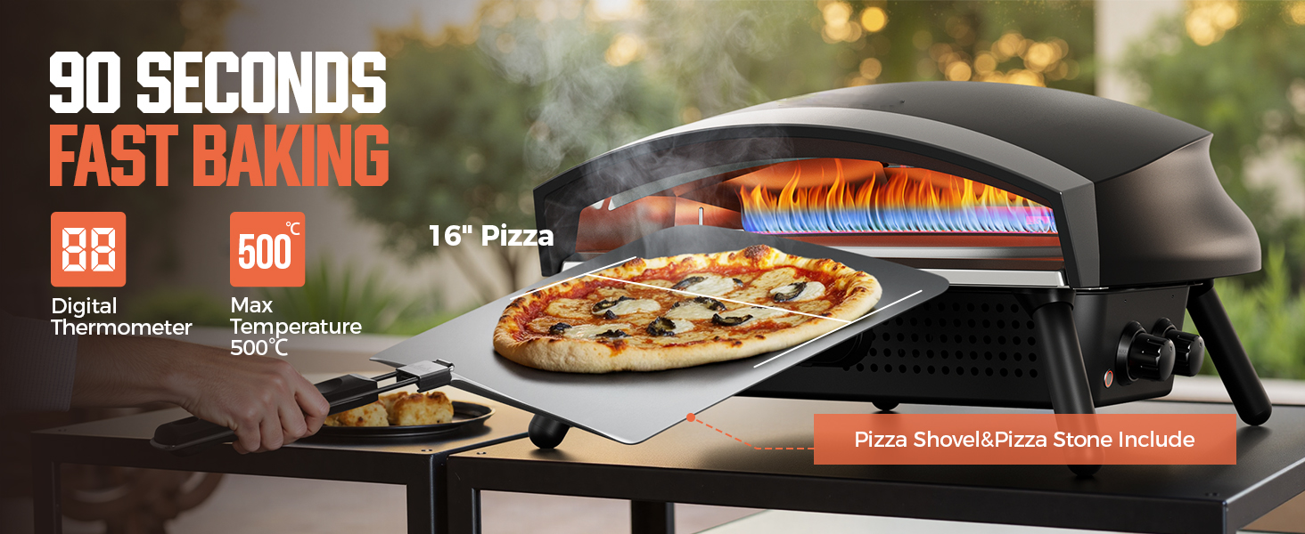 A high-performance 16" gas pizza oven engineered for fast, precise outdoor cooking. Heats to 950°F with a 29,000 BTU burner, cooks pizza in 60–90 seconds, and features an auto-rotating stone for even results. Built with durable materials, auto shut-off safety and a probe-ready interface for advanced temperature control. Ideal for pizza, steaks, vegetables and high-heat grilling.