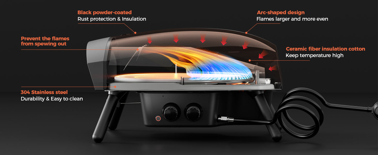 The optimized burner generates balanced top and bottom heat for fast stone recovery and even baking. Preheats to 950°F quickly and cooks a 16-inch pizza in 60–90 seconds with consistent results.